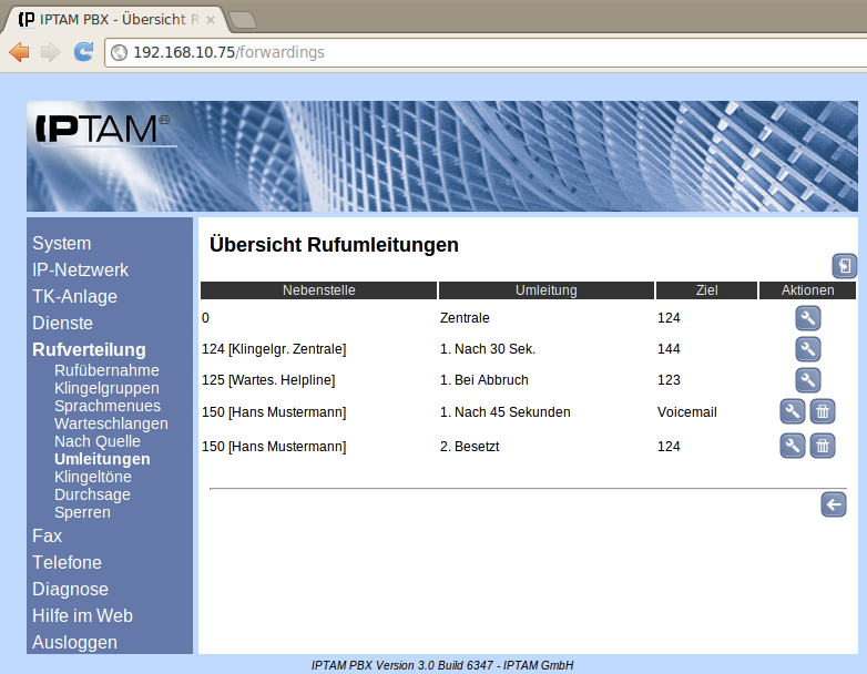 Jeder Anwender Ihrer IPTAM® PBX kann seine persönliche telefonische Erreichbarkeit durch unterschiedliche Umleitungen steuern (siehe dazu auch Abschnitt 3 „Rufumleitungen“ im Anwenderhandbuch).Der Administrator kann im Menü Rufverteilung ► Umleitungen eine Übersicht aller aktiven Umleitungen in der Telefonanlage einsehen sowie diese ändern oder neu konfigurieren. Neben den Umleitungen der Anwender werden auch die Weiterleitungen aus Warteschlangen und Klingelgruppen hier aufgelistet, so dass der Administrator an einer Stelle alle Umleitungen im Blick hat..