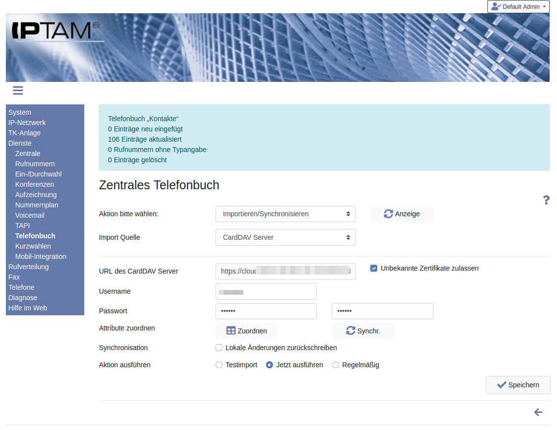 Dienste►Telefonbuch die Auswahl „Importieren/Synchronisieren“ und in der zweiten Auswahl dann „CardDAV Server“.