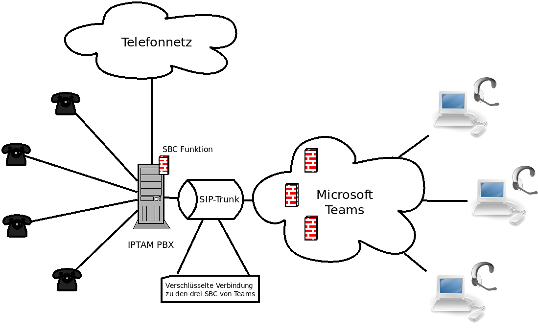 - Teams Anwender können über die IPTAM® PBX in das öffentliche Netz sowie zu Teilnehmern der IPTAM® PBX telefonieren.