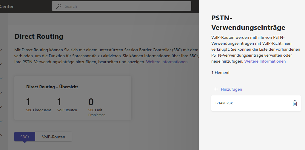 Zunächst wird ein „PSTN Verwendungseintrag“ benötigt. Dies ist lediglich eine Art Container, der andere Teile des Routings bündelt. Klicken Sie oben rechts auf der Seite zum „Direct Routing“ auf den Button „PSTN-Verwendungseinträge verwalten“. Klicken Sie dann auf „+ Hinzufügen“ und wählen Sie einen Namen, z.B. „IPTAM PBX“ (Abbildung rechts). Speichern Sie dann den Dialog.