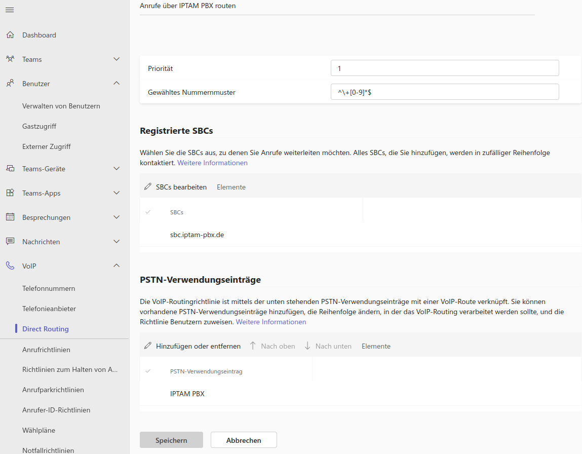 Fügen Sie bei „Gewähltes Rufnummernmuster“ einen regulären Ausdruck ein. Mit diesem Muster wird die Routing-Regel abhängig vom Ziel bestimmt. Wählen Sie „^\+[0-9}*$“. Damit werden alle Rufnummern erfasst (Beginnend mit einem „+“ gefolgt von Ziffern). Klicken Sie auf den Button „SBCs hinzufügen“ und wählen Sie den Eintrag mit Ihrem SBC aus. Der Button „PSTN-Verwendungseinträge...“ öffnet die Auswahl der „Verwendungseinträge“. Aktivieren Sie hier den zuvor angelegten Eintrag. Rechts sehen Sie beispielhafte Eintragungen. Nach dem Speichern gelangen Sie wieder in die Ansicht zum „Direct Routing“.