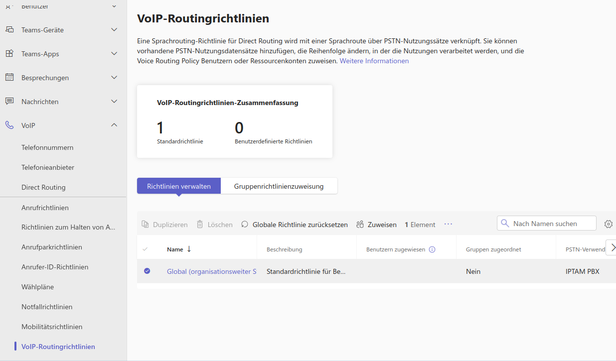 In der Navigation des Teams Admin Center gehen Sie nun im Punkt „VoIP“ zum Eintrag „VoIP-Routingrichtlinien“. Klicken Sie auf den Link „Global (organisationsweiter Standard)“. Fügen Sie den zu Beginn definierten „PSTN-Verwendungseintrag“ hinzu und speichern Sie die Einstellung. Alternativ können Sie auch eine eigene Routingrichtlinie definieren.