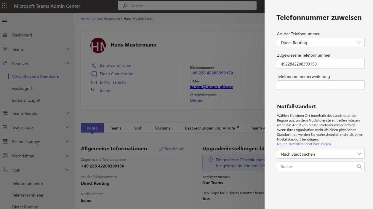 Jetzt fügen Sie bei allen Anwendern, denen eine entsprechende Lizenz zugewiesen wurde, eine Rufnummer hinzu. Dazu gehen Sie im Teams Admin Center auf den Menüpunkt „Benutzer“ und wählen den Eintrag „Verwalten von Benutzern“ aus. Klicken Sie auf den betreffenden Eintrag. Im Reiter „Konto“ klicken Sie auf „Bearbeiten“. Aus der Ausklappbox „Art der Telefonnummer“ oben wählen Sie „Direct Routing“ aus. Tragen Sie die Rufnummer als E.164 Rufnummer ein (Beispiel in Abbildung rechts).