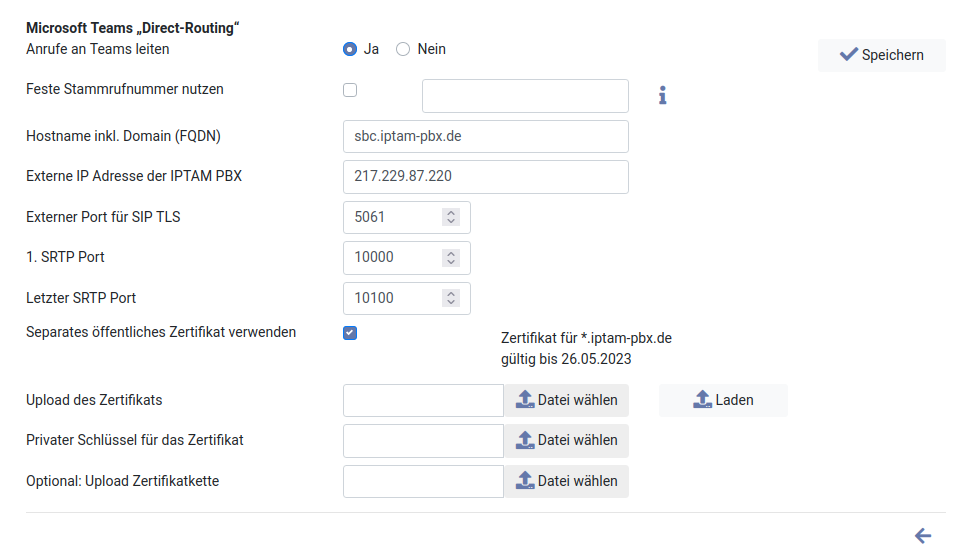 Wegen der NAT Behandlung muss die öffentliche IP-Adresse Ihrer IPTAM® PBX in das betreffende Feld eingetragen werden. Da Änderungen der IP-Adresse hier nicht automatisch angepasst werden, ist der Betrieb an Anschlüssen mit dynamisch wechselnder IP-Adresse nicht sinnvoll.