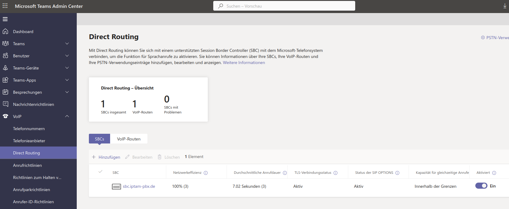 Nach der Konfiguration im Admin-Bereich von Teams und der Einrichtung in der IPTAM® PBX sollten Sie zunächst die Funktion prüfen. Die IPTAM® PBX sendet SIP Options Pakete an die Teams-Plattform und erhält von dort Antworten. Auch die Teams-Plattform sendet solche Pakete.Sobald nach einer angemessenen Wartezeit beide Seiten einen Erfolg zeigen, können Anrufe getestet werden. Dazu sollten Sie zunächst versuchen, einen Anwender auf Teams von einem Telefon aus anzurufen (Anruf an die Nebenstelle des Anwenders). Nach einer kurzen Zeitspanne sollte der Teams-Client klingeln (Der Rufaufbau dauert geringfügig länger als der Anruf an interne Teilnehmer).