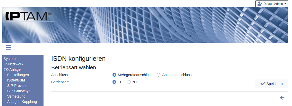 Die Auswahl der Betriebsart legt fest, ob der Anschluss für den Betrieb am öffentlichen Netz oder für den Anschluss von Endgeräten wie z.B. Fax-Geräten oder Telefonen bzw, Telefonanlagen dienen soll. Für die hier beschriebene Anbindung der IPTAM PBX an das öffentliche Netz ist „TETerminal Equipment