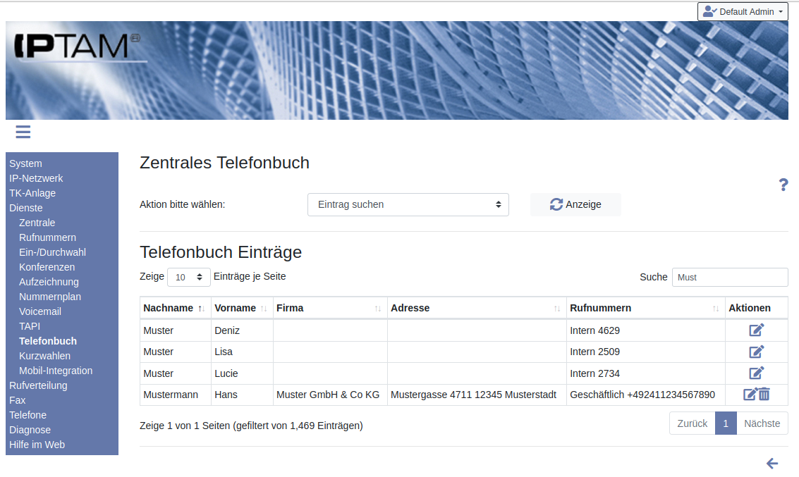 Dienste►Telefonbuch. Tragen Sie den Suchbegriff in das Suchfeld ein. Der Begriff wird in allen Spalten gesucht, Sie können auch nach einer Rufnummer suchen. Jeder Tastendruck verfeinert die Suche. Einen Kontakt mit allen Rufnummern können Sie über das Icon