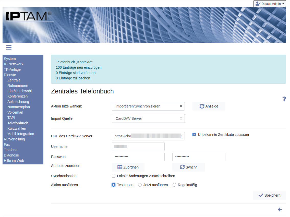 Image Sie können das Telefonbuch Ihrer IPTAM® PBX mit einem CardDAV Server verbinden und Kontaktdaten von dort übernehmen oder diese auch synchronisieren. Wählen Sie dazu im Menü Dienste►Telefonbuch die Auswahl „Importieren/Synchronisieren“ und in der zweiten Auswahl dann „CardDAV Server“.