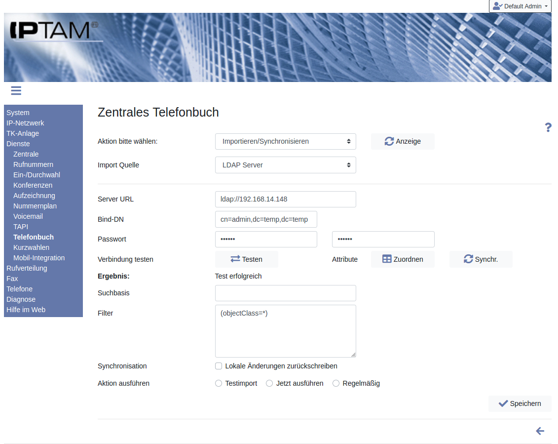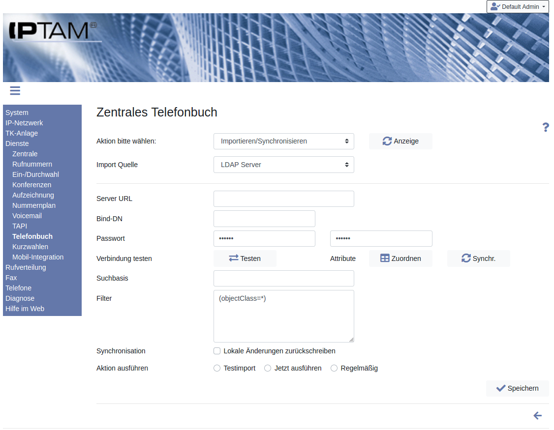 Image Sie können das Telefonbuch Ihrer IPTAM® PBX mit einem LDAP Server verbinden und Kontaktdaten von dort übernehmen oder diese auch synchronisieren. Wählen Sie dazu im Menü Dienste►Telefonbuch die Auswahl „Importieren/Synchronisieren“ und in der zweiten Auswahl dann „LDAP Server“.